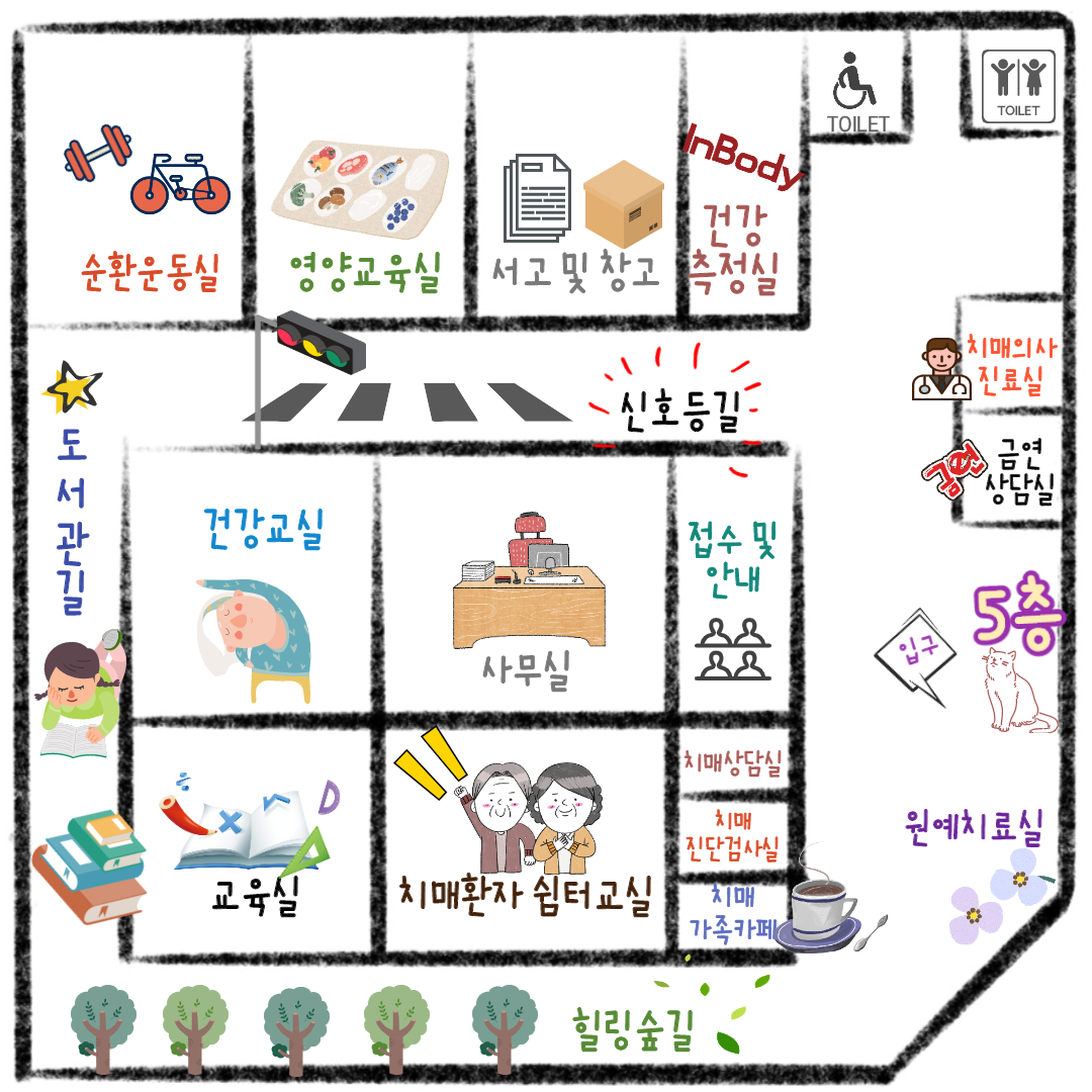 홈 기관소개 동부센터 평면도 평면도 이미지 확대보기 5층 입구기준 시계방향(바깥쪽 라인) - 원예치료실 , 힐링숲길, 도서관길, 순환운동실, 영양교육실, 서고 및 창고, 건강측정실,화장실, 치매의사 진료실,금연상담실 5층 입구기준 시계방향(안쪽 라인) - 접수 및 안내, 치매상담실,치매진단검사실,치매가족카페,치매환자 쉼터교실,교육실,건강교실,사무실
