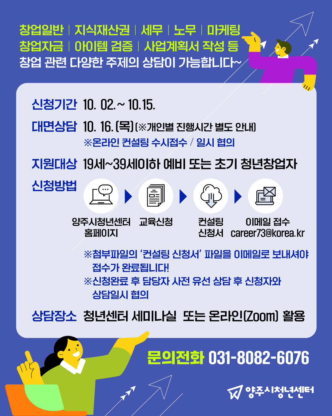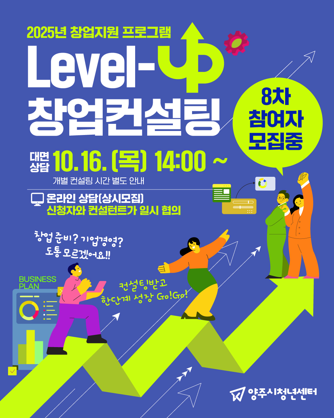 예비 및 초기 청년창업자를 위한 1:1 맞춤형 창업컨설팅 프로그램 「Level-up 창업컨설팅」 참여자를 모집합니다. ■ 신청기간 : 2025.10.2.(목)~2025.10.15.(수) ■ 대면상담일 : 2025.10.16.(목)(*개인별 상담시간 개별 안내 예정) ■ 상담방법 : 대면 또는 온라인 (Zoom) ■ 상담장소 : 청년센터 세미나실 또는 온라인 ■ 지원대상 : 19세~39세 이하 예비 및 초기 청년창업자 ■ 상담내용 : 창업일반, 지식재산권, 세무, 노무, 마케팅, 창업자금, 아이템 검증, 사업계획서 작성 등 ■ 신청방법 : 양주시청년센터 홈페이지→교육신청→'컨설팅 신청서' 작성 후 이메일 제출 ■ 문의전화 : 청년센터 청년정책팀 031-8082-6076 |